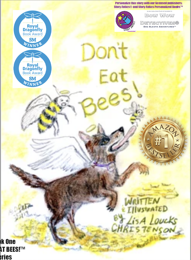 Buy a personalized copy with your dogs name through Story Antics Personalized books, or an online edition through Story Antics®. Don't Eat Bees!" is an original #1 bestselling and double award-winning story by Lisa Loucks-Christenson. Winning two 2020 Royal Dragonfly Book Award SM for Best Illustrations (ebook) and an Honorable Mention for Picture Books 6 and older. By special arrangement, the Don't Eat Bees!™ book series, comic is under license with Story Antics® and Story Antics Personalized Books. Don't Eat Bees!™ is a legal trademark owned by Lisa Loucks-Christenson, the original creator. Bow Wow Detectives™ is a legal trademark owned by Lisa Loucks-Christenson Story Antics® is a registered trademark owned by Lisa Loucks-Christenson Story Antics Personalized Books™ is a legal trademark owned by Lisa Loucks-Christenson Copyright © 2023 Lisa Loucks-Christenson |
